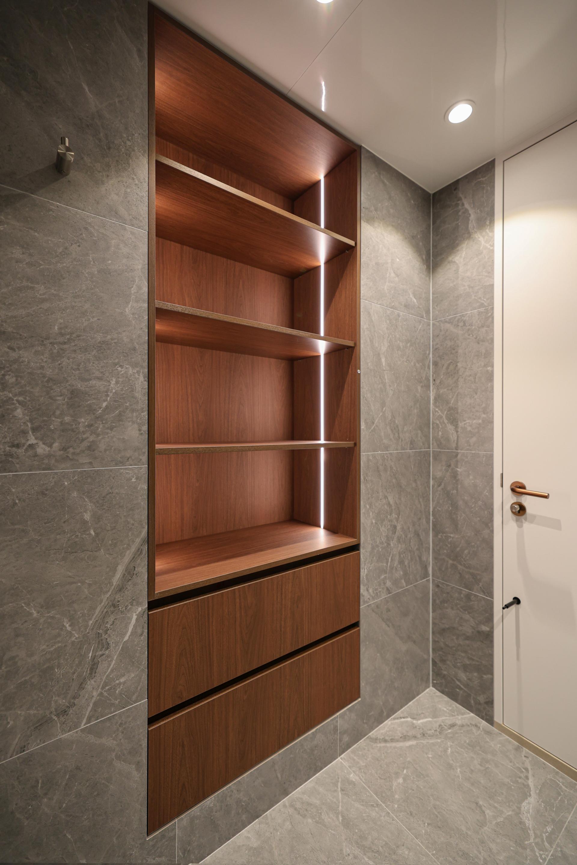 소프트 그레이 / 마블 패턴 / 타일 선반형 탑볼 세면대 / 하프 조적형 부스 / 대형 제작장