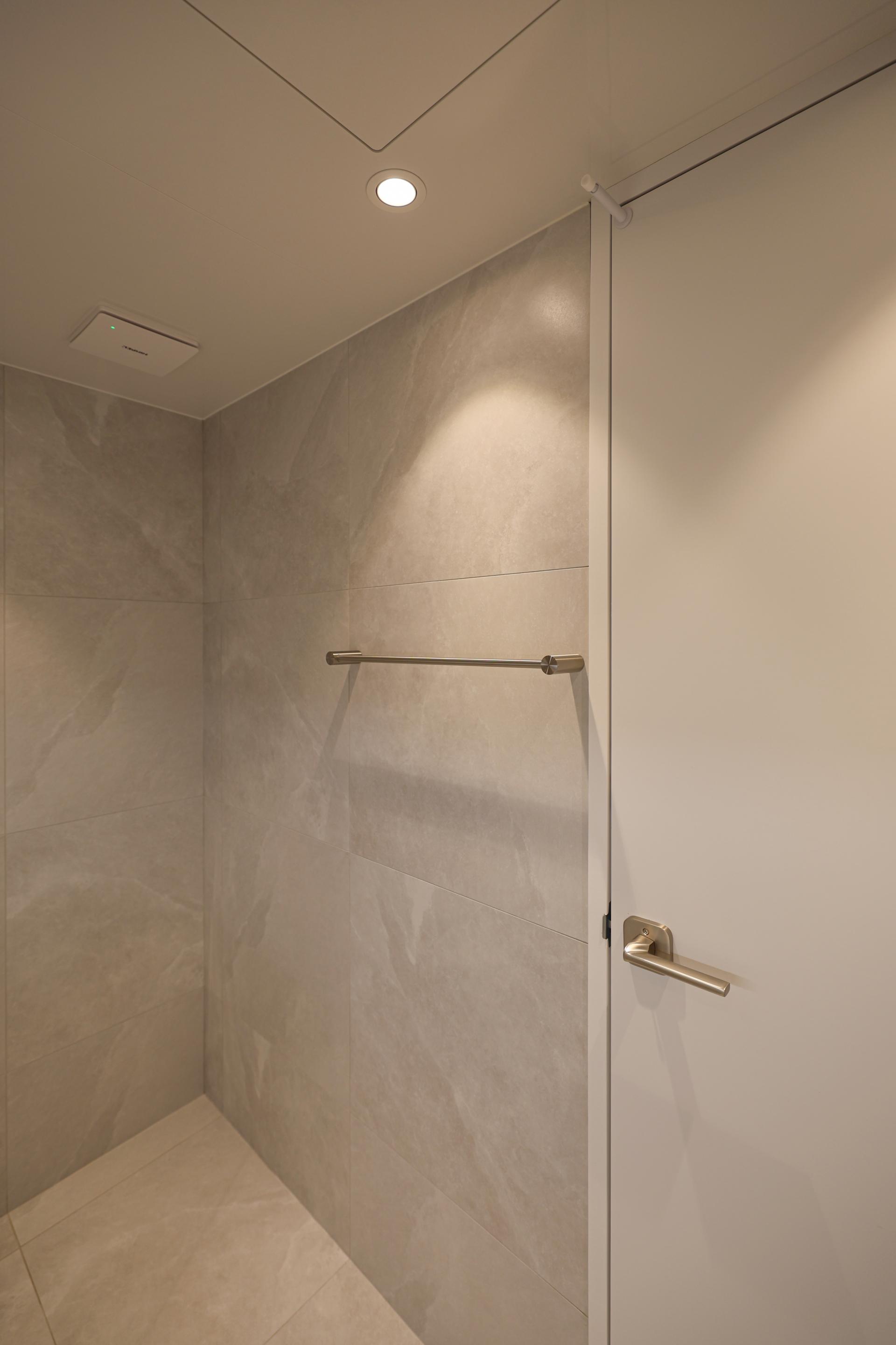 베이지 톤 / 마블 패턴 / 하프 조적 파티션 / 은경 플랩장 / 니켈 코너 선반