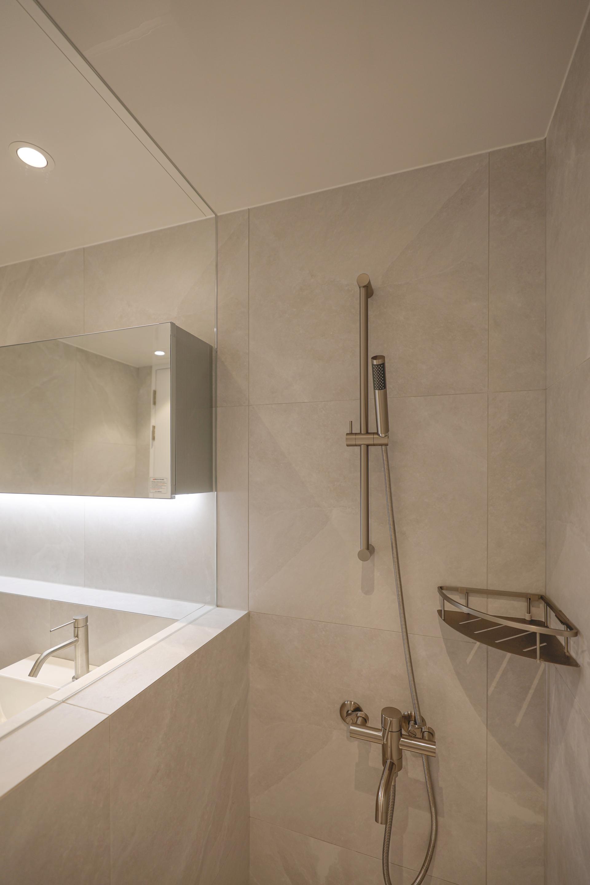 베이지 톤 / 마블 패턴 / 하프 조적 파티션 / 은경 플랩장 / 니켈 코너 선반 > 부분 리모델링