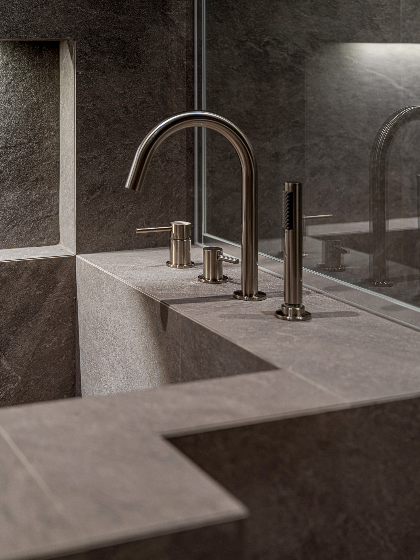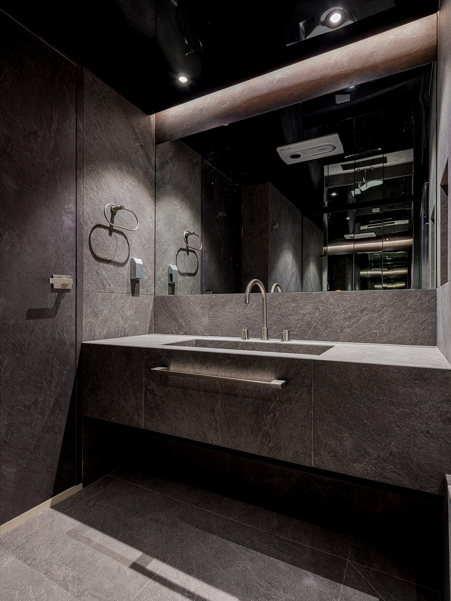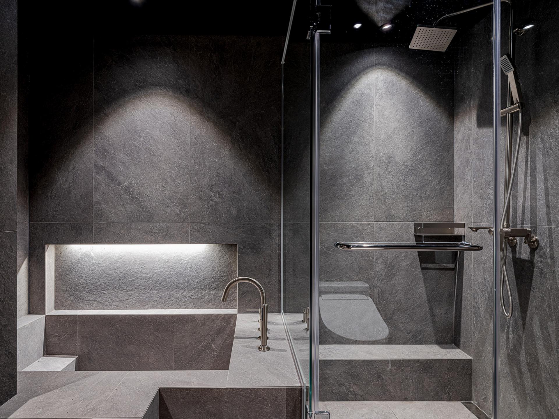 차콜 톤 / 스톤 패턴 / 블랙 이노솔 / 조적 욕조 및 파티션 / 타일 세면대