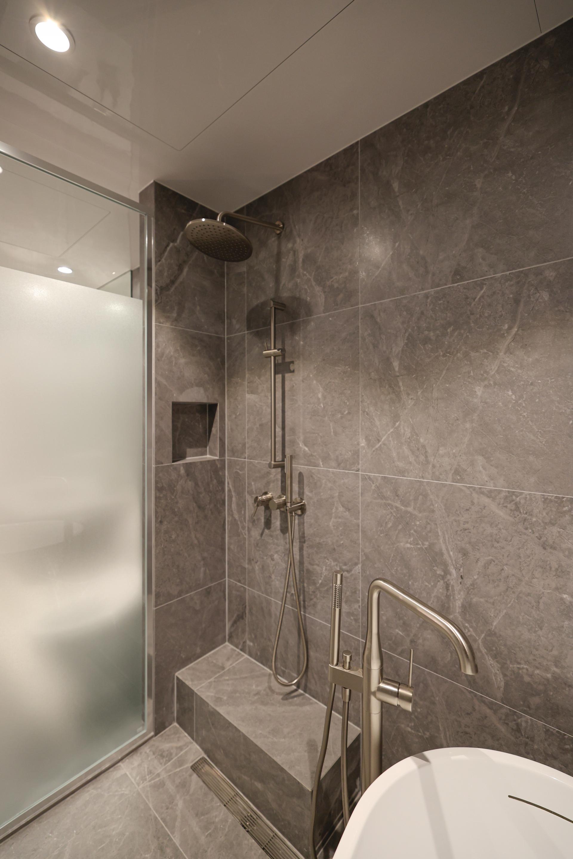 소프트 그레이 / 마블 패턴 / 타일 선반형 탑볼 세면대 / 하프 조적형 부스 / 대형 제작장