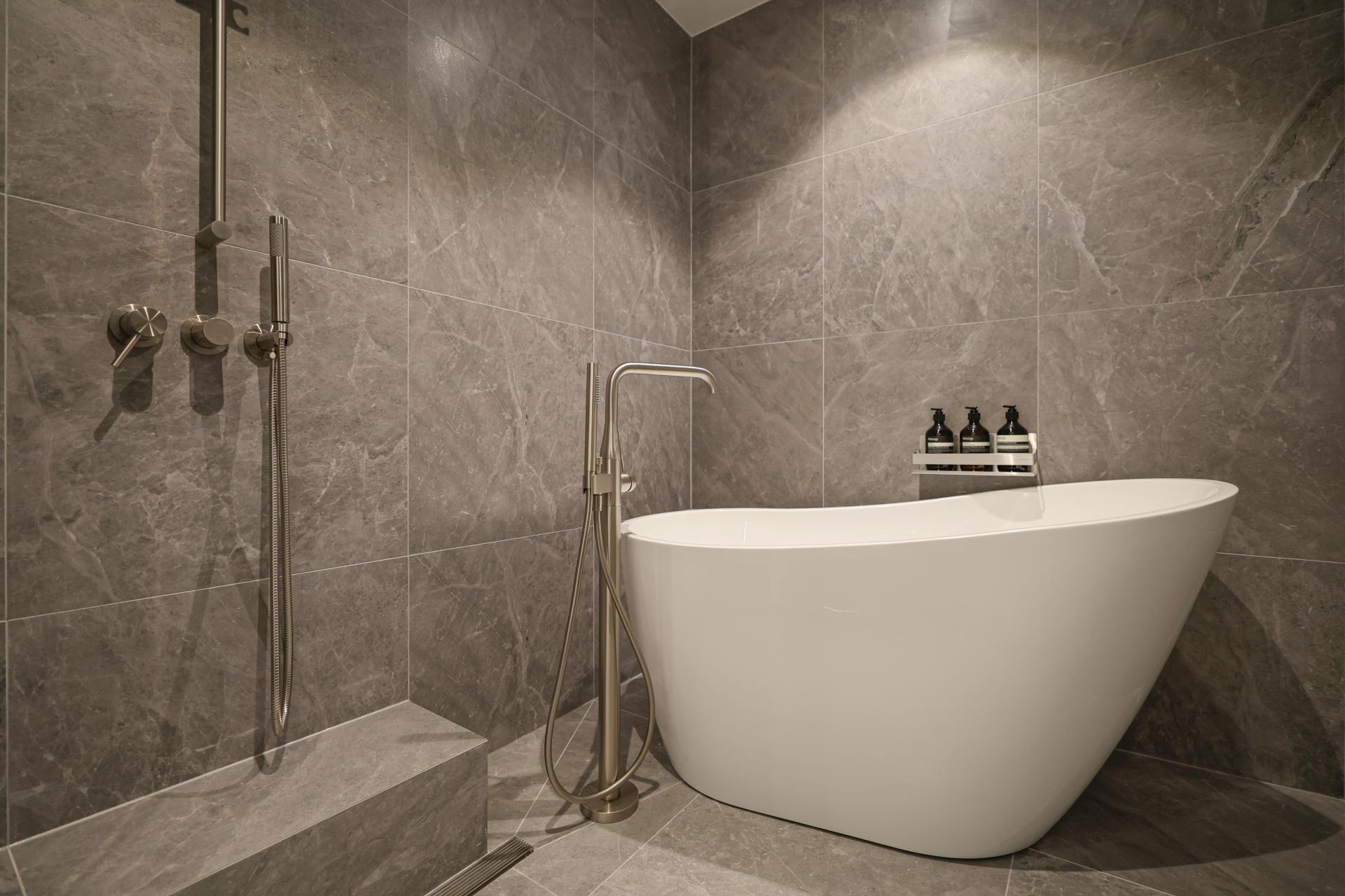 그레이 / 마블 패턴 / 타일 세면대 및 은경 매립 수전 / 이동식 욕조 및 스탠딩 수전 / 제작 오픈 수납장 > 부분 리모델링